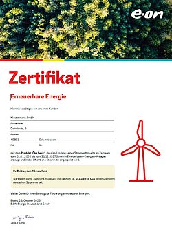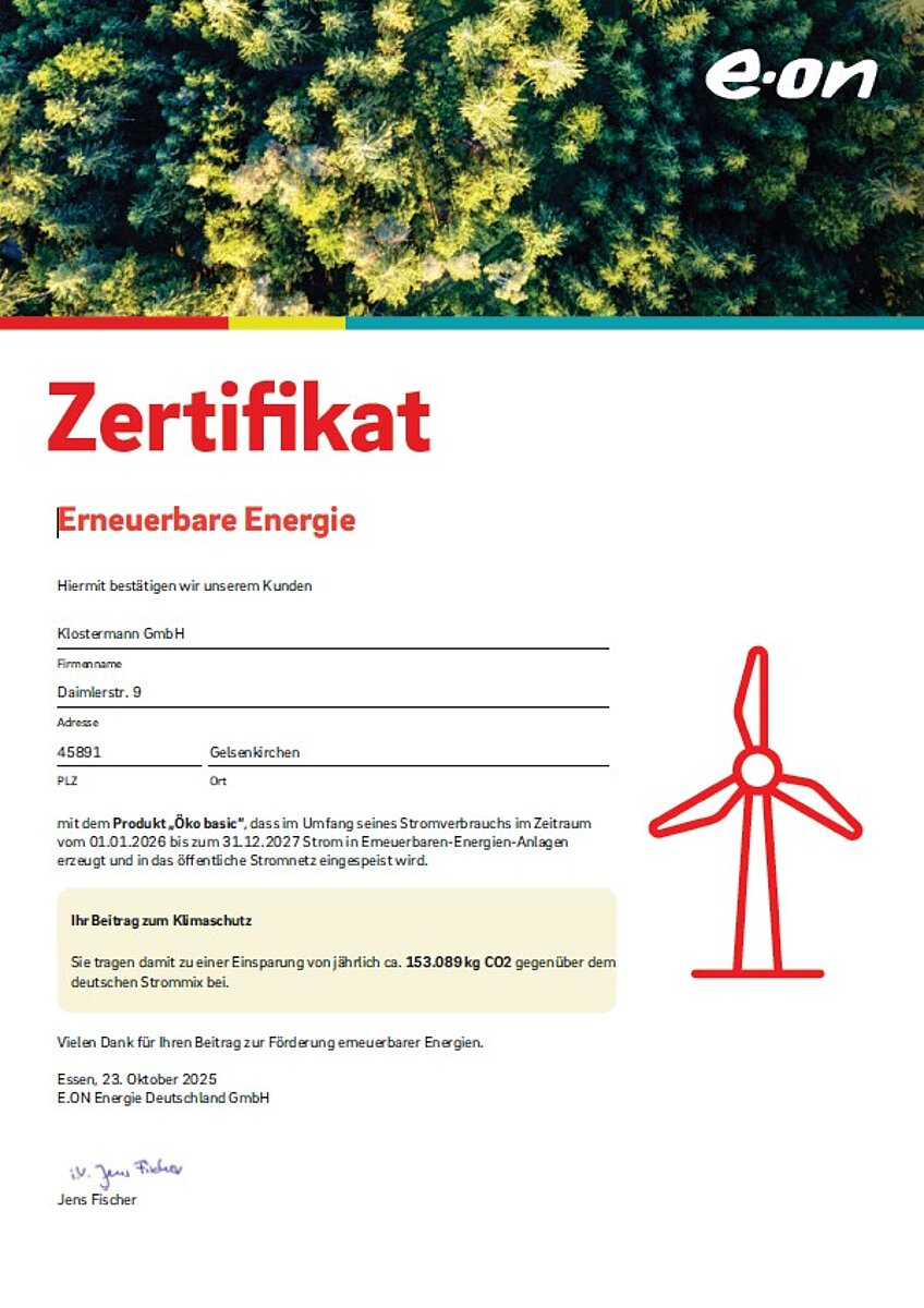 Auch 2026 und 2027 nutzen wir ausschließlich Strom aus erneuerbaren Energien. 100% ÖKOSTROM ist einer unserer Beiträge für den Klimaschutz durch Einsparung von über 350 Tonnen CO2 pro Jahr.